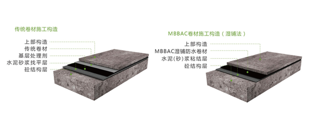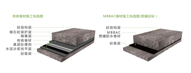 粘結可靠,便于檢修。MBBAC卷材與結構牢固、持久粘結。卷材出現任何局部破壞,水都會被限定在局部很小范圍內,不竄水,不滲漏,退一步來說,即使防水層薄弱點和結構裂縫高度吻合而出現滲漏,也極易檢修。
