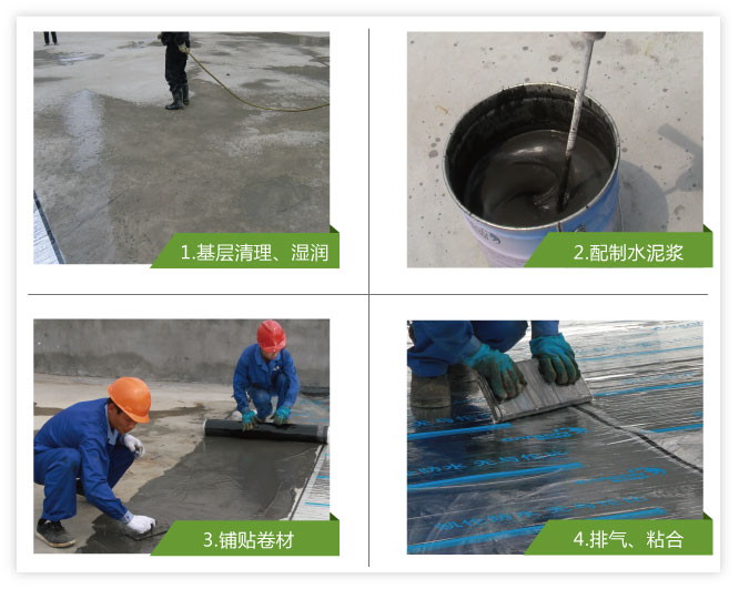 將攪拌好的水泥(砂)漿鋪抹于基層上,同時卷材滾鋪于水泥(砂)漿上。